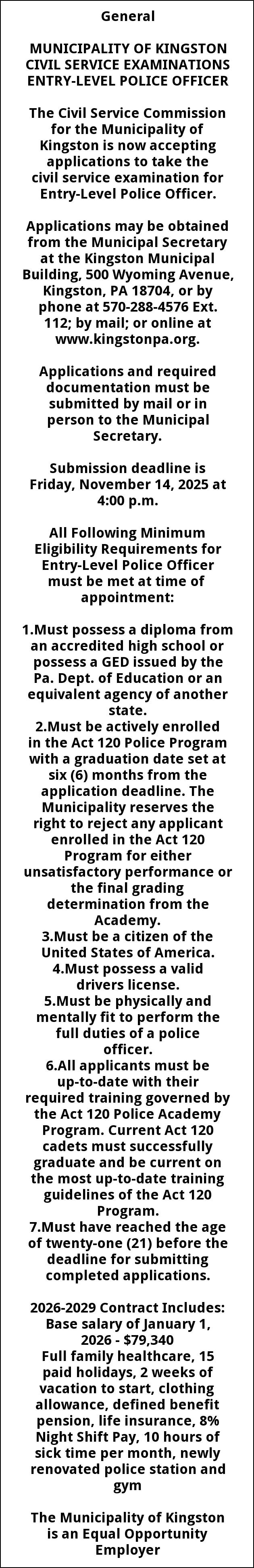 The Civil Service Commission for the Municipality of Kingston is now accepting applications to take the civil service examination for Entry-Level Police Officer.